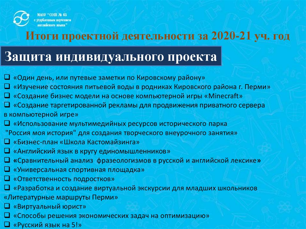 Итоги проектной деятельности за 2020-21 уч. годЗащита индивидуального проекта 10 класс