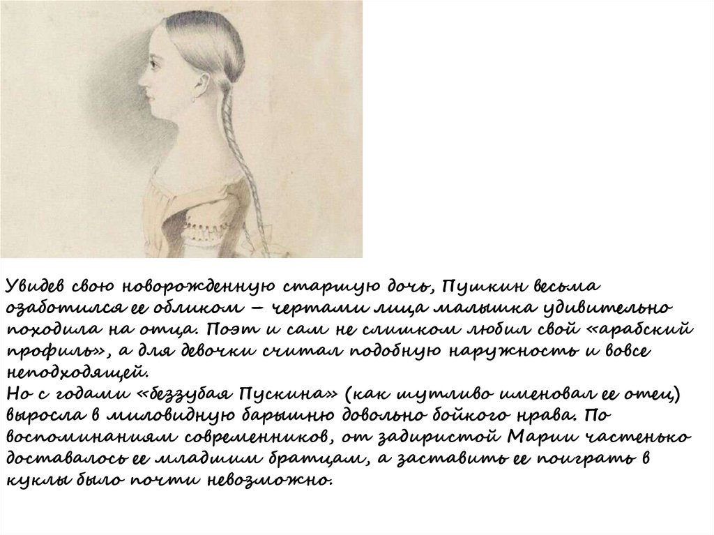Увидев свою новорожденную старшую дочь, Пушкин весьмаозаботился ее обликом – чертами лица малышка удивительно