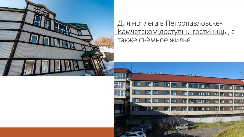 Для ночлега в ПетропавловскеКамчатском доступны гостиницы, атакже съёмное жильё.