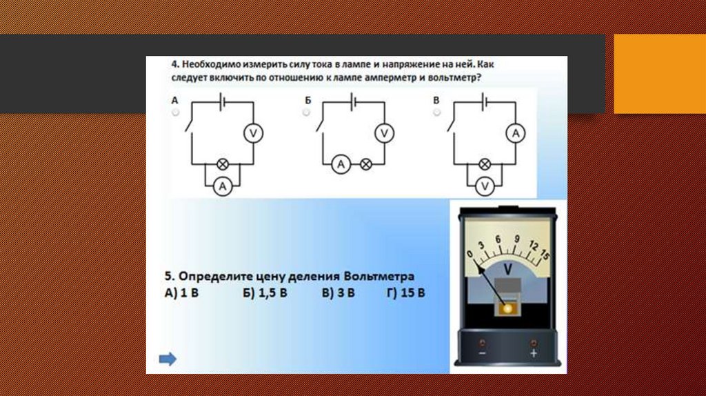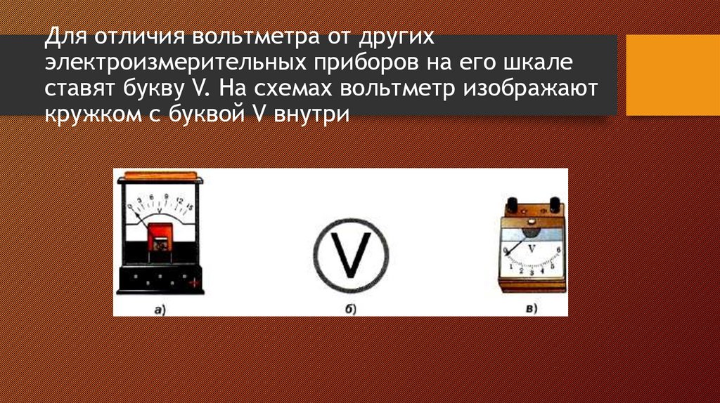 Для отличия вольтметра от другихэлектроизмерительных приборов на его шкале