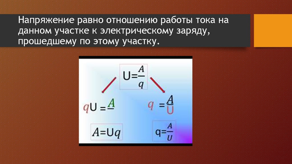 Напряжение равно отношению работы тока наданном участке к электрическому заряду,