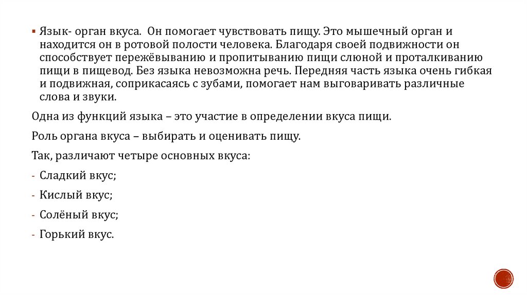 Язык- орган вкуса. Он помогает чувствовать пищу. Это мышечный орган инаходится он в ротовой полости человека. Благодаря своей подвижности он