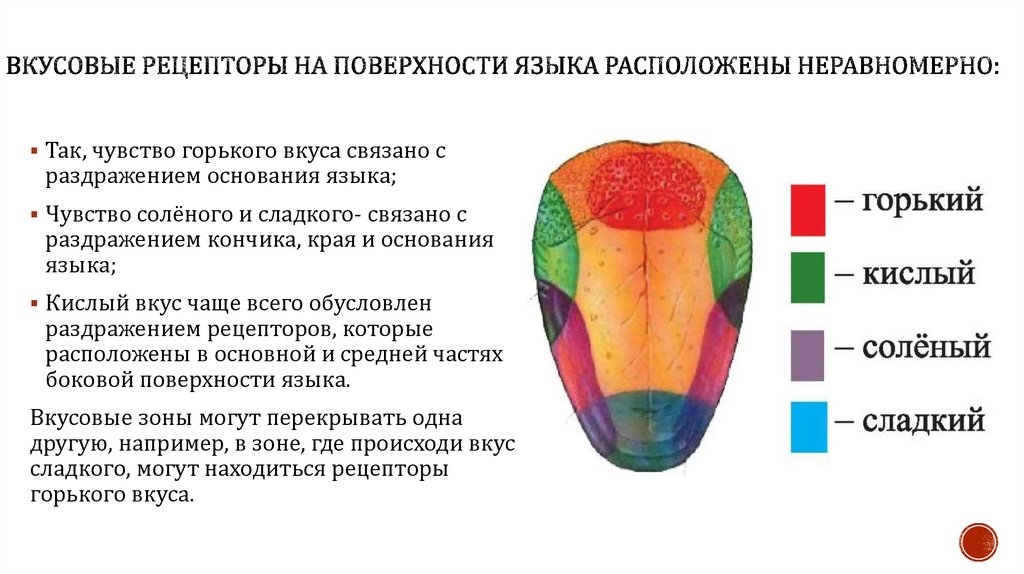 Так, чувство горького вкуса связано сраздражением основания языка;
