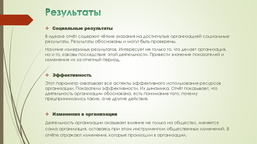 Социальные результатыВ идеале отчёт содержит чёткие указания на достигнутые организацией социальные