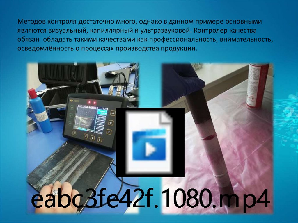 Методов контроля достаточно много, однако в данном примере основнымиявляются визуальный, капиллярный и ультразвуковой. Контролер качества