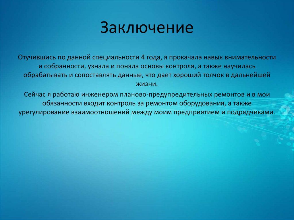 Сейчас я работаю инженером планово-предупредительных ремонтов и в мои