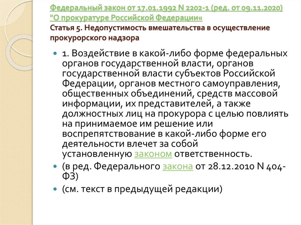 Федеральный закон от 17.01.1992 N 2202-1 (ред. от 09.11.2020)"О прокуратуре Российской Федерации«