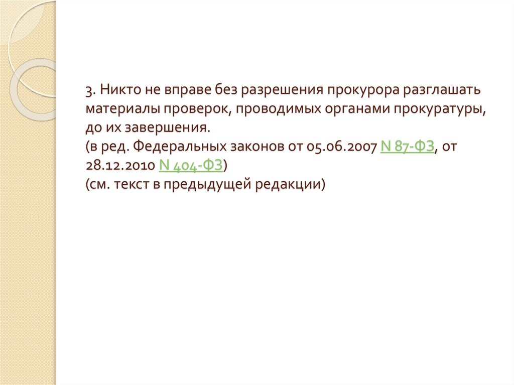 3. Никто не вправе без разрешения прокурора разглашатьматериалы проверок, проводимых органами прокуратуры,