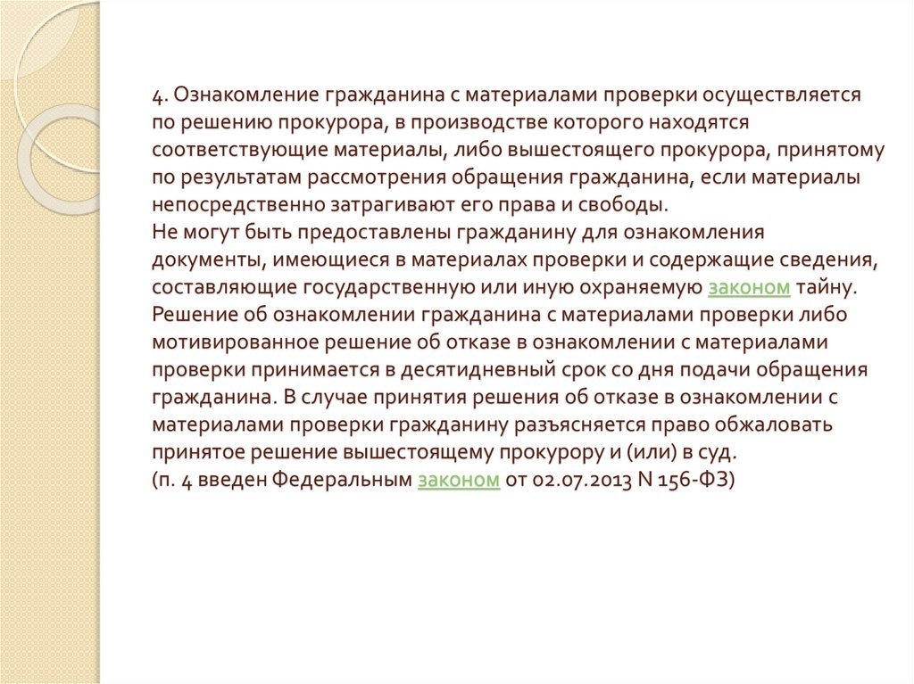 4. Ознакомление гражданина с материалами проверки осуществляетсяпо решению прокурора, в производстве которого находятся