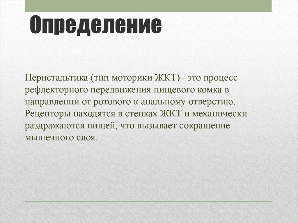 ОпределениеПеристальтика (тип моторики ЖКТ)– это процесс