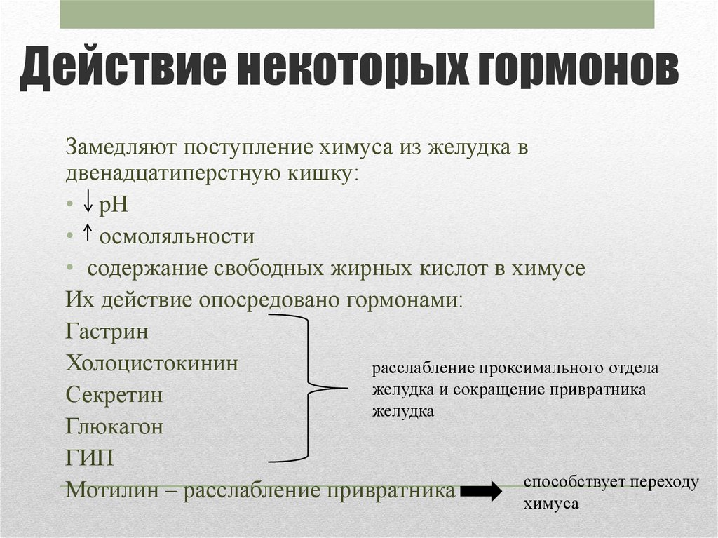 Действие некоторых гормоновЗамедляют поступление химуса из желудка в