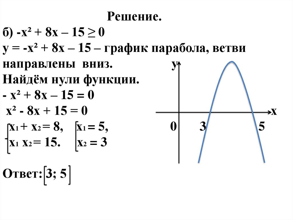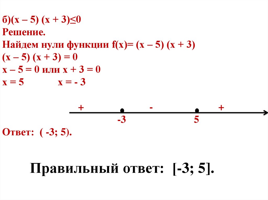 Найдем нули функции f(х)= (х – 5) (х + 3)