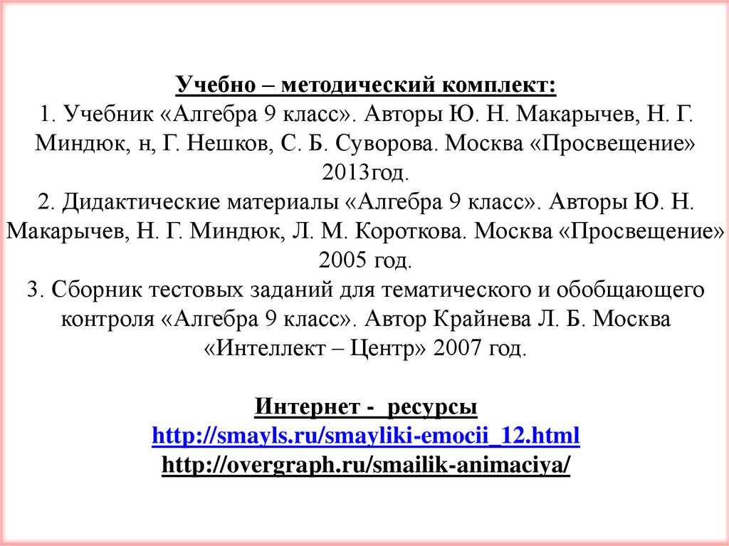 Учебно – методический комплект:1. Учебник «Алгебра 9 класс». Авторы Ю. Н. Макарычев, Н. Г.