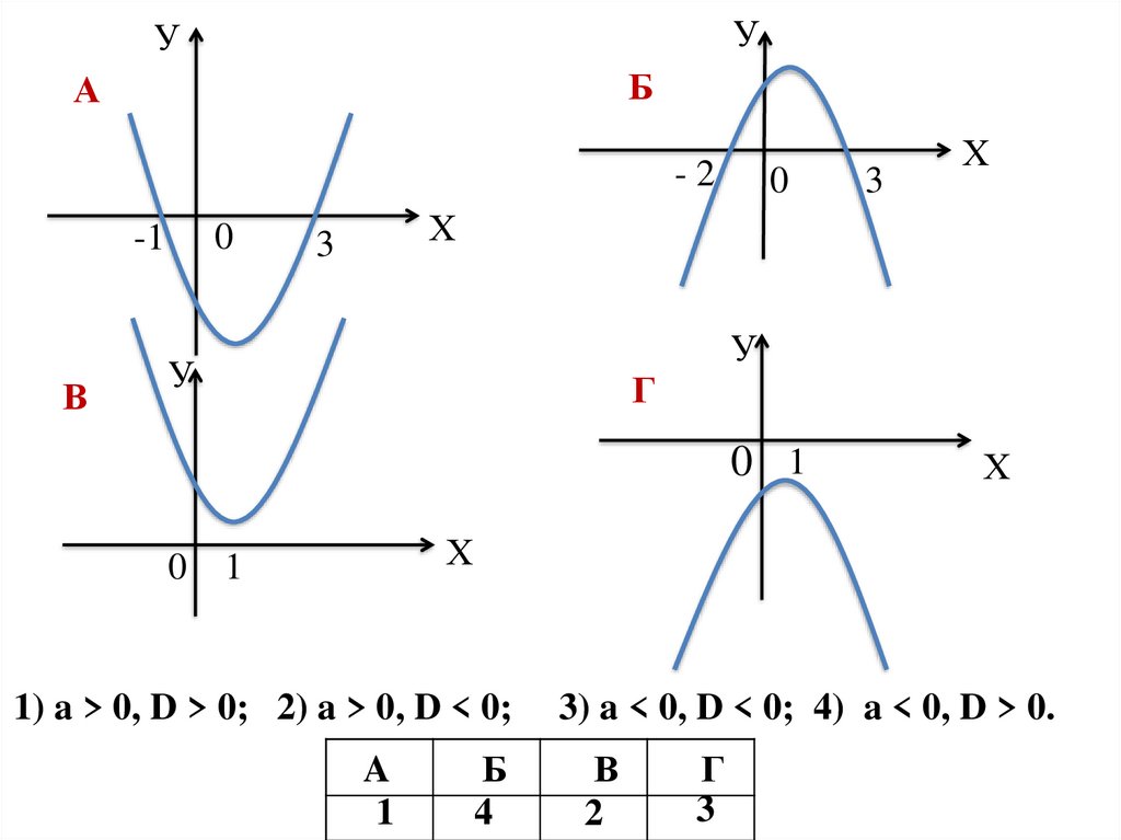 3) a < 0, D < 0; 4) a < 0, D > 0.