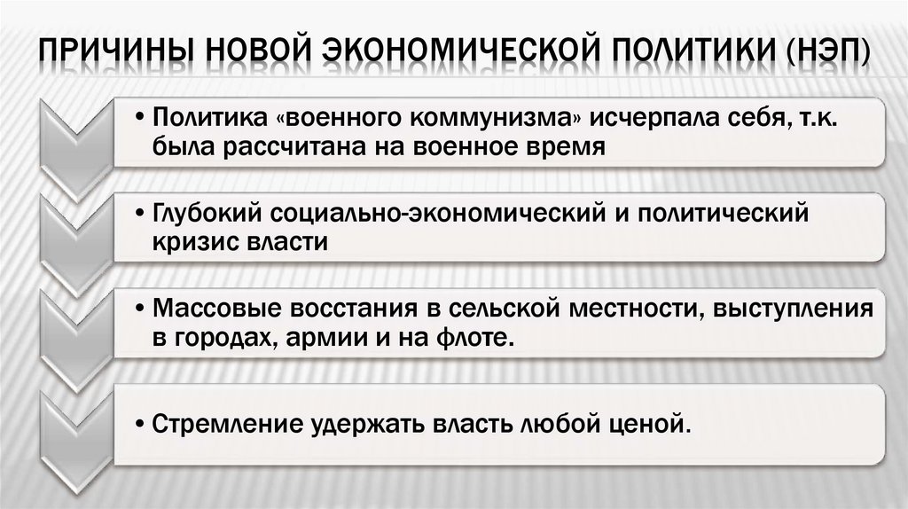 ПРИЧИНЫ НОВОЙ ЭКОНОМИЧЕСКОЙ ПОЛИТИКИ (НЭП)•Политика «военного коммунизма» исчерпала себя, т.к.