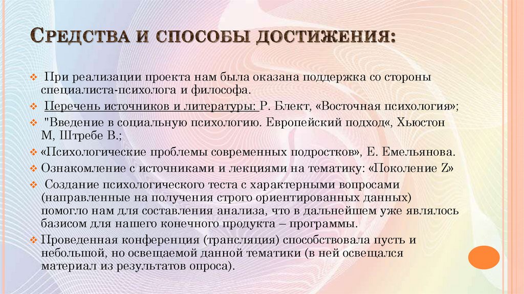 При реализации проекта нам была оказана поддержка со стороныспециалиста-психолога и философа.