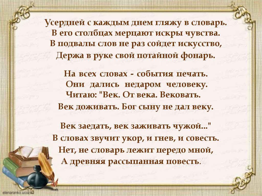 Усердней с каждым днем гляжу в словарь.В его столбцах мерцают искры чувства.