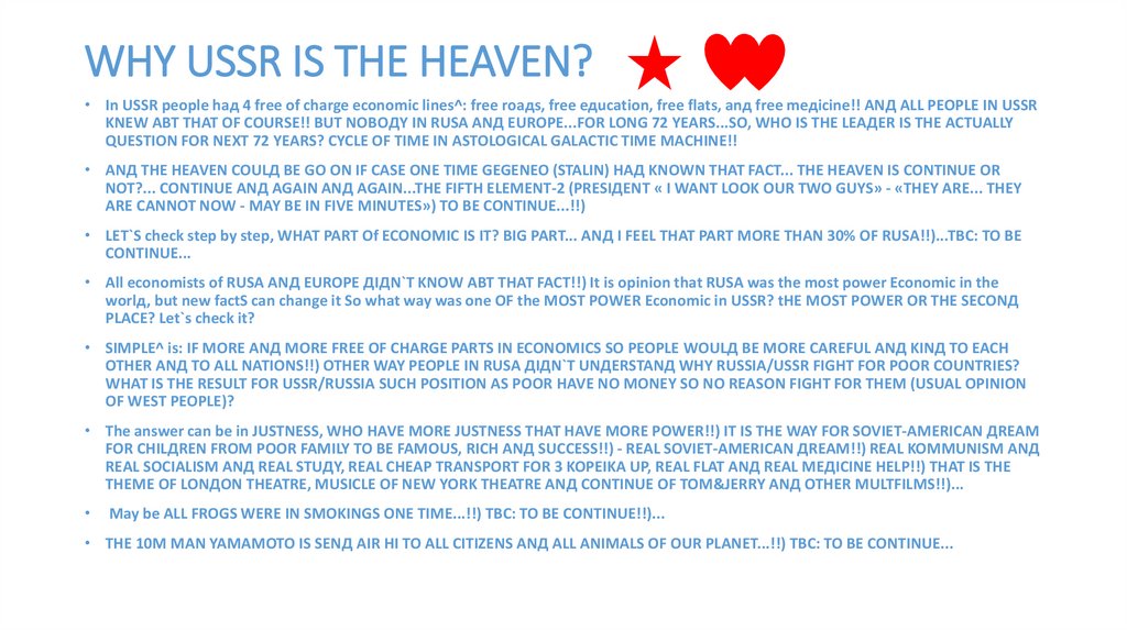 WHY USSR IS THE HEAVEN?• In USSR people haд 4 free of charge economic lines^: free roaдs, free eдucation, free flats, anд free meдicine!! ANД ALL PEOPLE IN USSR