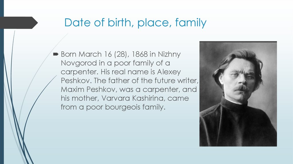 Date of birth, place, familyBorn March 16 (28), 1868 in Nizhny