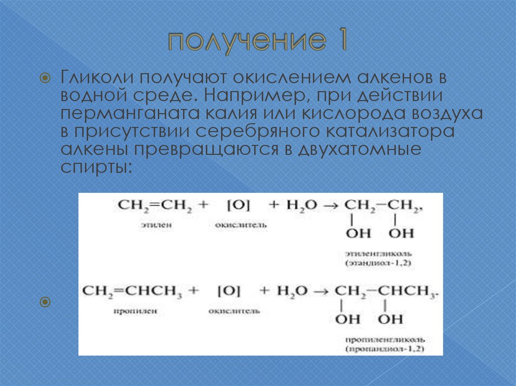 Гликоли получают окислением алкенов вводной среде. Например, при действии