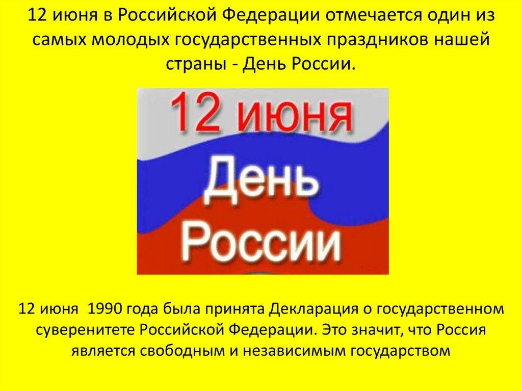 12 июня в Российской Федерации отмечается один изсамых молодых государственных праздников нашей