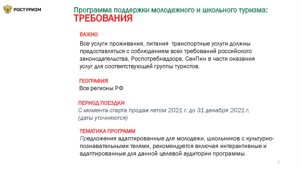 Программа поддержки молодежного и школьного туризма:ТРЕБОВАНИЯ