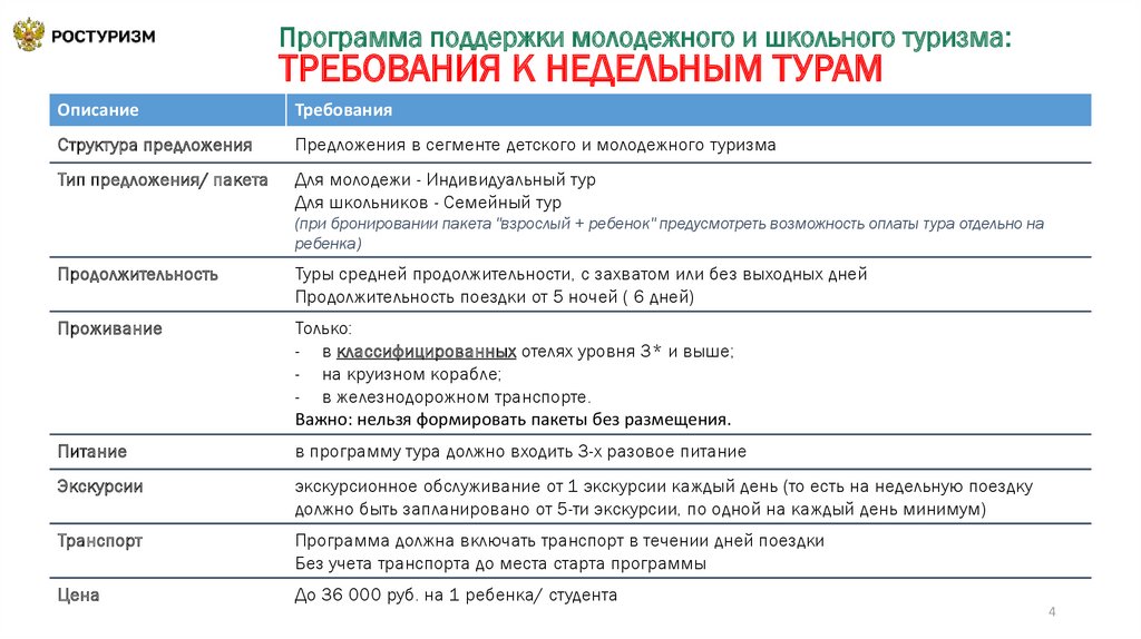 Программа поддержки молодежного и школьного туризма:ТРЕБОВАНИЯ К НЕДЕЛЬНЫМ ТУРАМ
