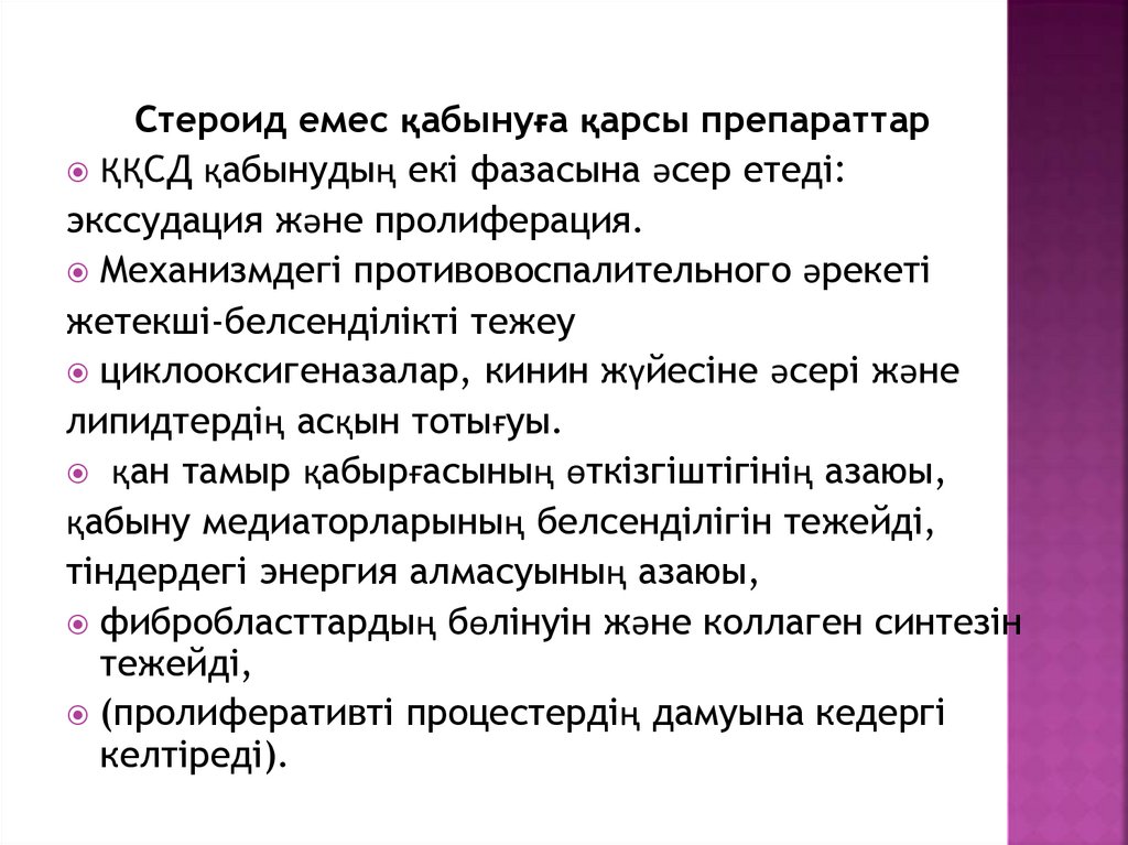 Стероид емес қабынуға қарсы препараттарҚҚСД қабынудың екі фазасына әсер етеді: