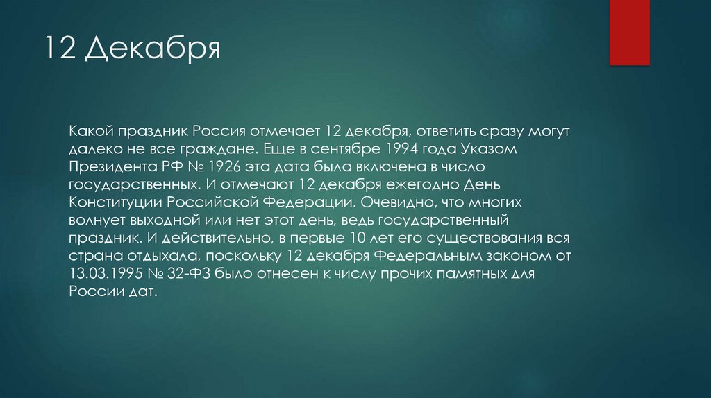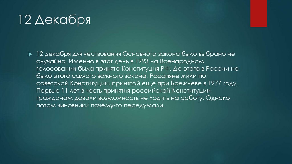 12 Декабря12 декабря для чествования Основного закона было выбрано не