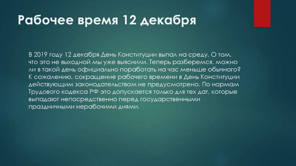 Рабочее время 12 декабряВ 2019 году 12 декабря День Конституции выпал на среду. О том,