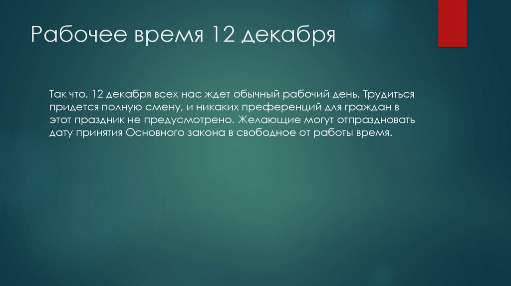 Рабочее время 12 декабряТак что, 12 декабря всех нас ждет обычный рабочий день. Трудиться
