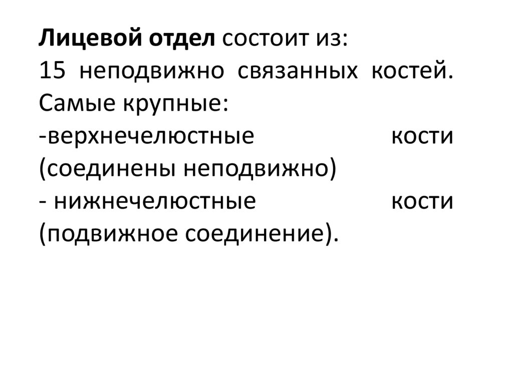 Лицевой отдел состоит из:15 неподвижно связанных костей.