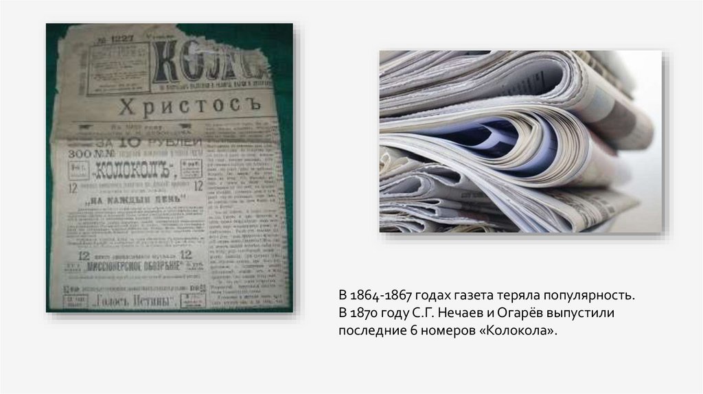 В 1864-1867 годах газета теряла популярность.В 1870 году С.Г. Нечаев и Огарёв выпустили