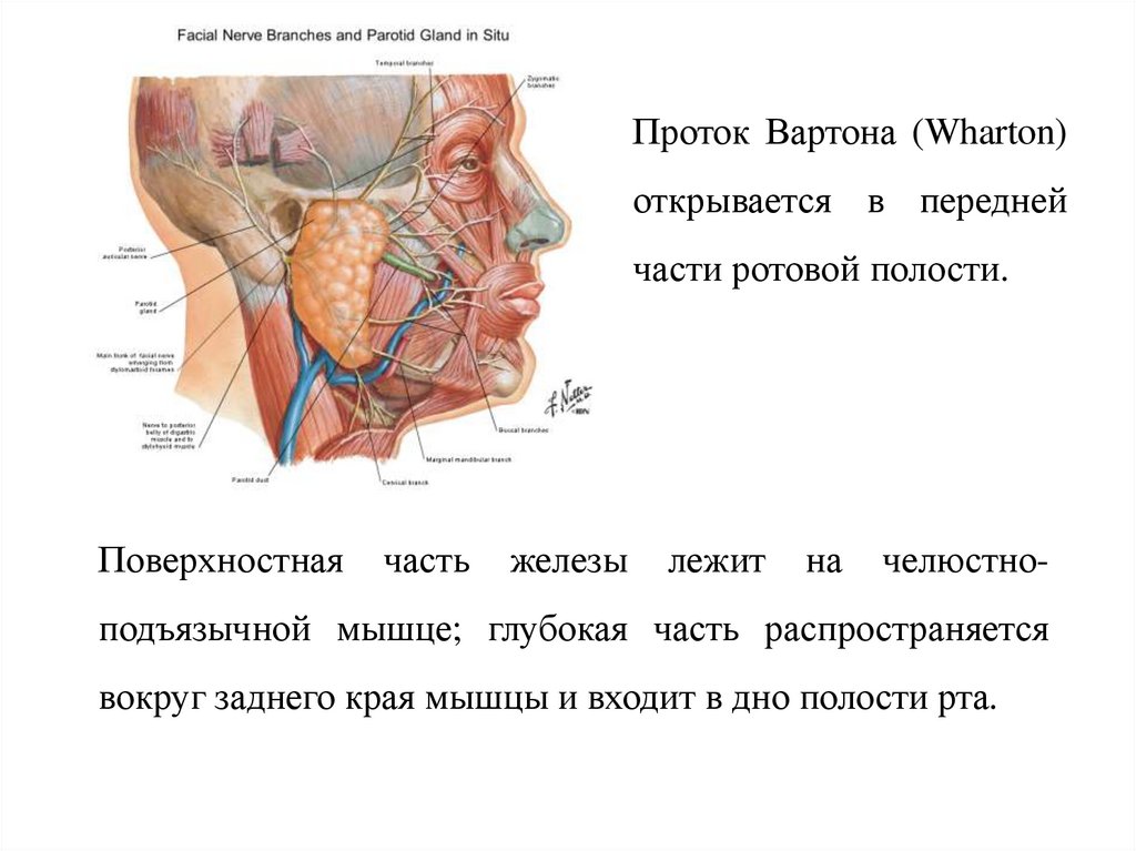 Проток Вартона (Wharton)открывается в передней