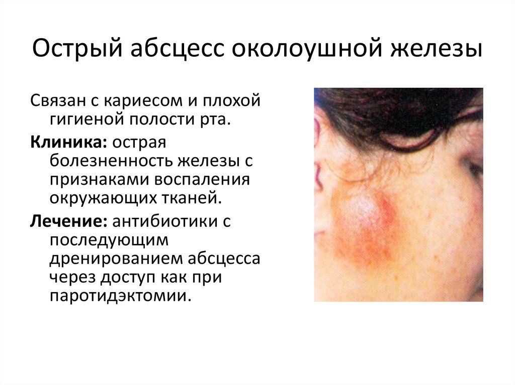 Острый абсцесс околоушной железыСвязан с кариесом и плохой