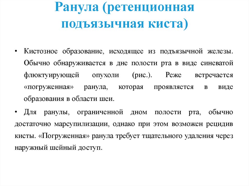• Для ранулы, ограниченной дном полости рта, обычно