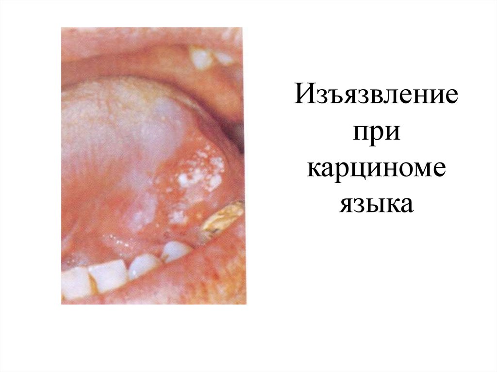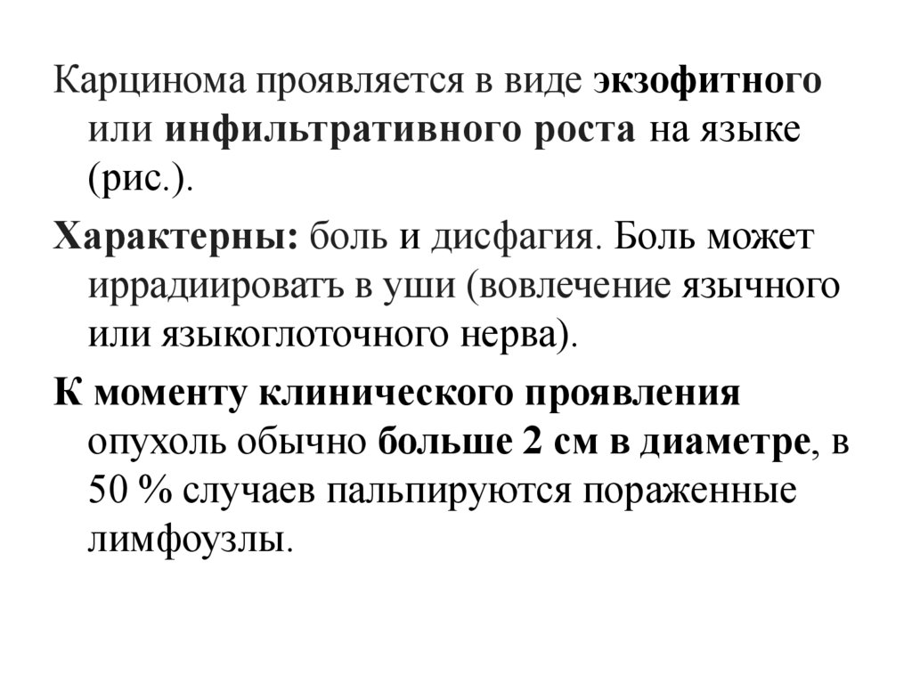 Карцинома проявляется в виде экзофитногоили инфильтративного роста на языке