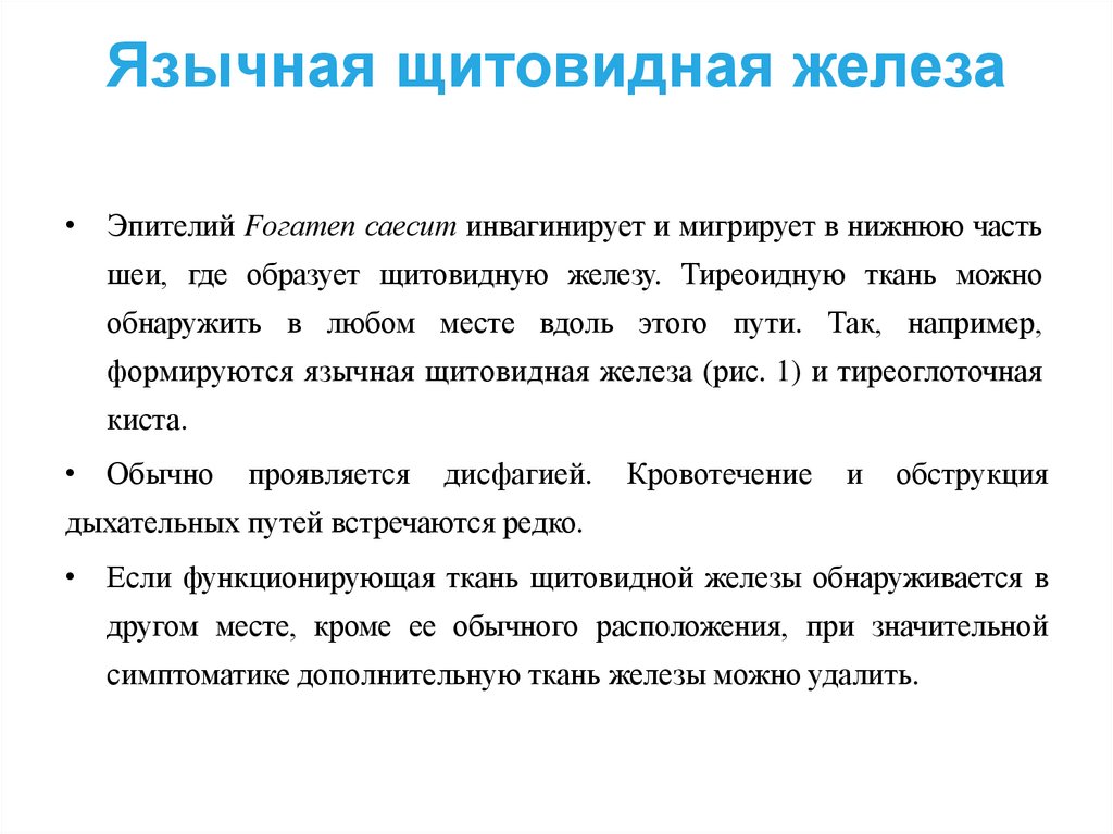 Язычная щитовидная железа• Эпителий Fогатеп саесит инвагинирует и мигрирует в нижнюю часть