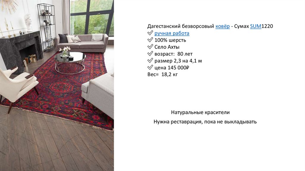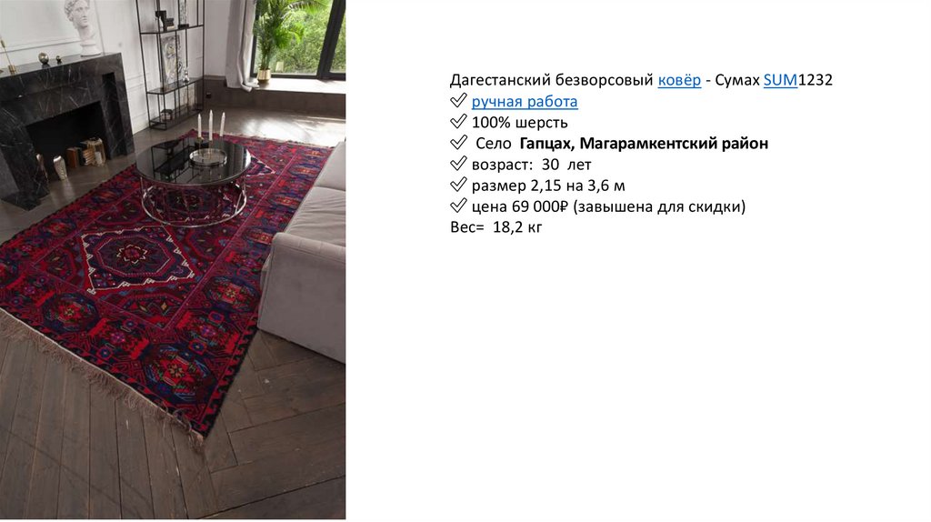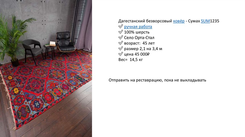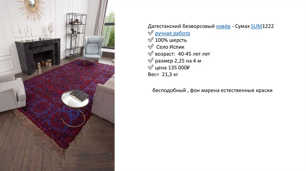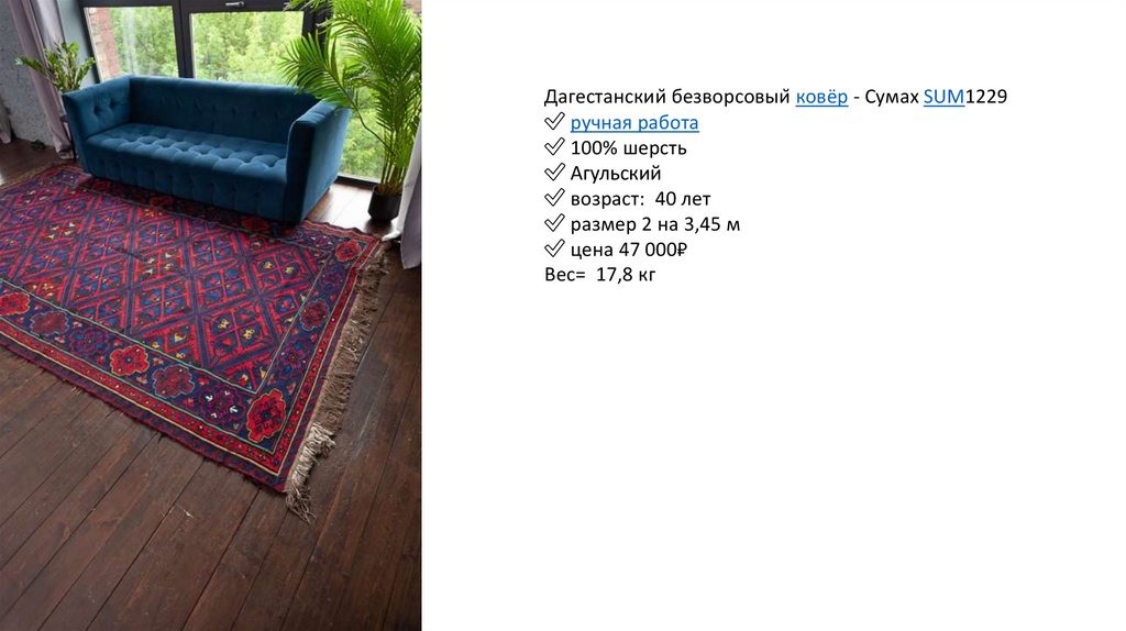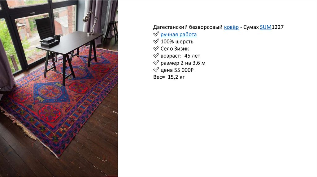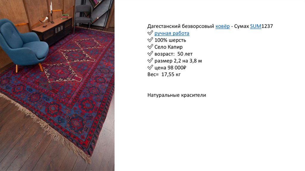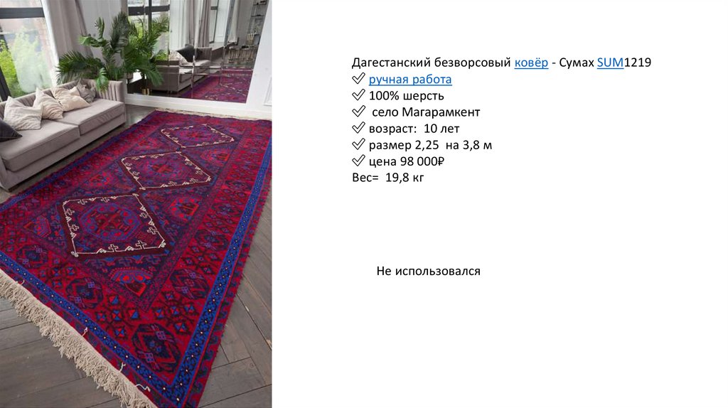 Дагестанский безворсовый ковёр - Сумах SUM1219✅ ручная работа