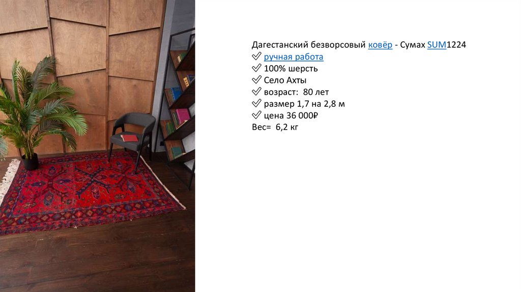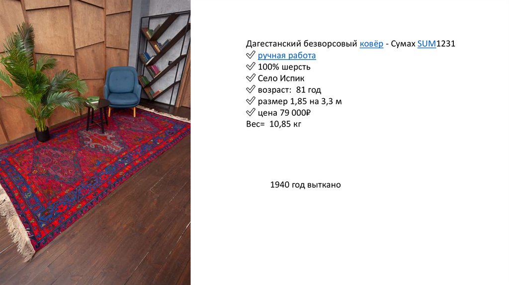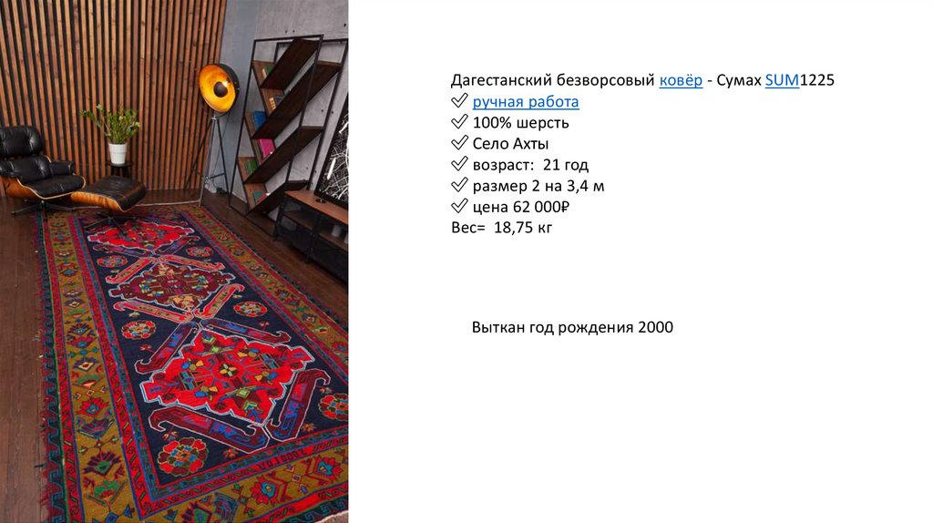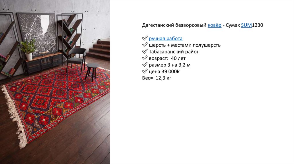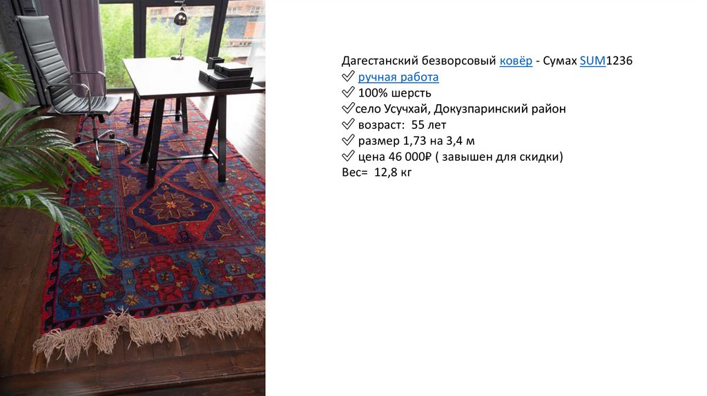 Дагестанский безворсовый ковёр - Сумах SUM1234✅ ручная работа