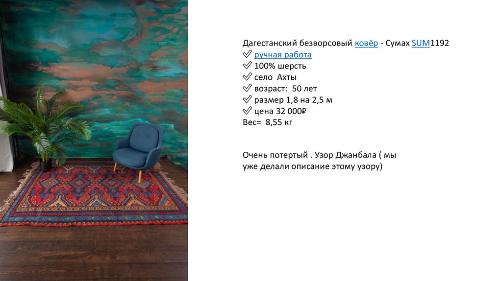 Дагестанский безворсовый ковёр - Сумах SUM1192✅ ручная работа