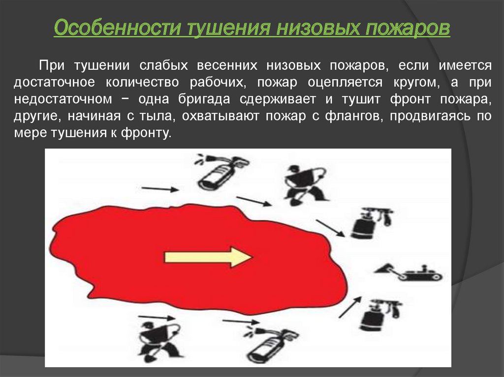 Особенности тушения низовых пожаровПри тушении слабых весенних низовых пожаров, если имеется