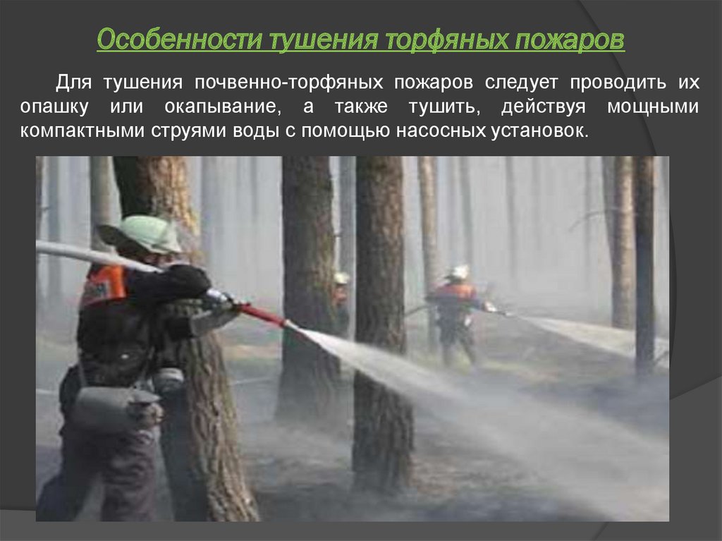 Особенности тушения торфяных пожаровДля тушения почвенно-торфяных пожаров следует проводить их