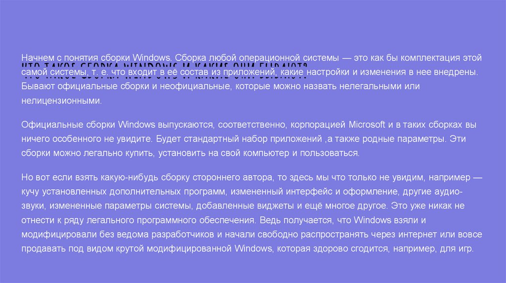 Начнем с понятия сборки Windows. Сборка любой операционной системы — это как бы комплектация этойЧТО ТАКОЕ СБОРКА WINDOWS И КАКИЕ ОНИ БЫВАЮТ?
