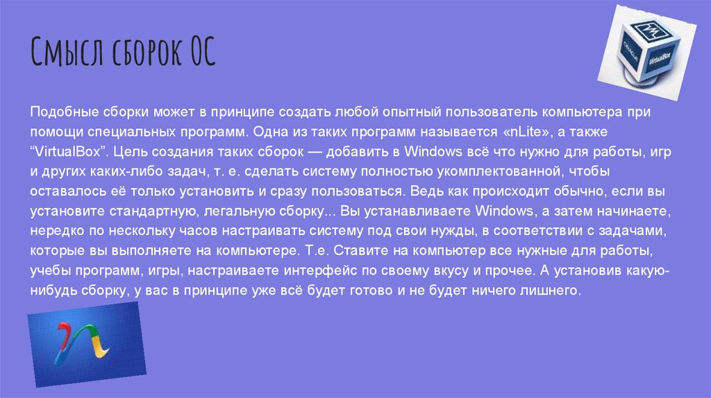 “VirtualBox”. Цель создания таких сборок — добавить в Windows всё что нужно для работы, игр