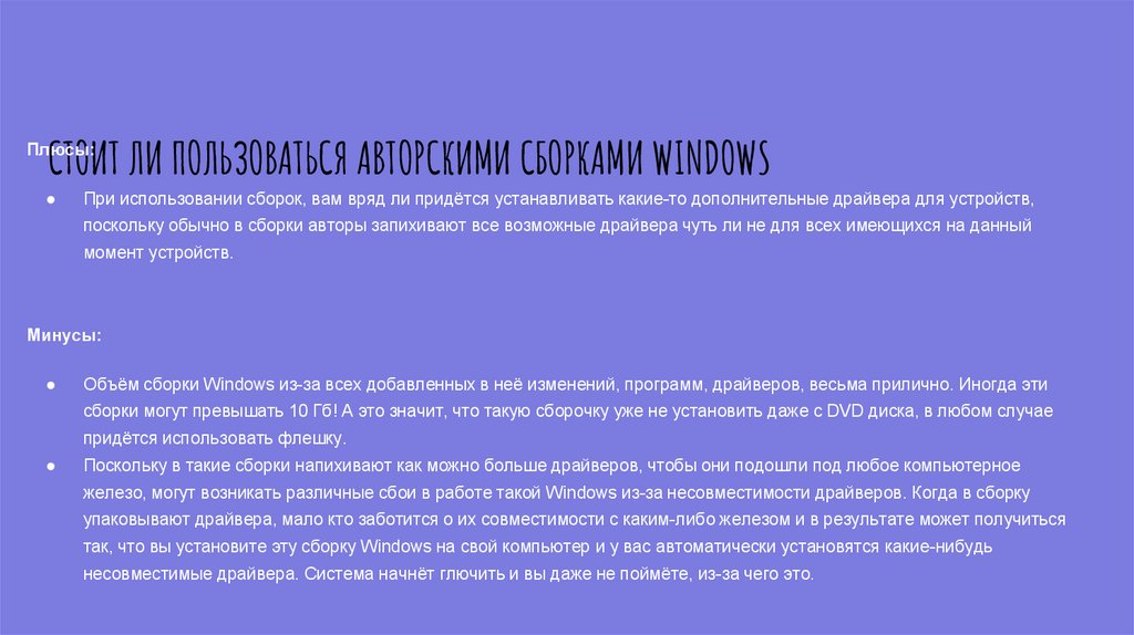 СТОИТ ЛИ ПОЛЬЗОВАТЬСЯ АВТОРСКИМИ СБОРКАМИ WINDOWSПлюсы: