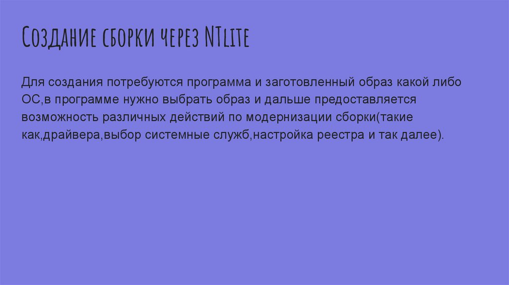 Создание сборки через NTliteДля создания потребуются программа и заготовленный образ какой либо