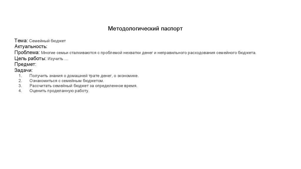 Методологический паспортТема: Семейный бюджет