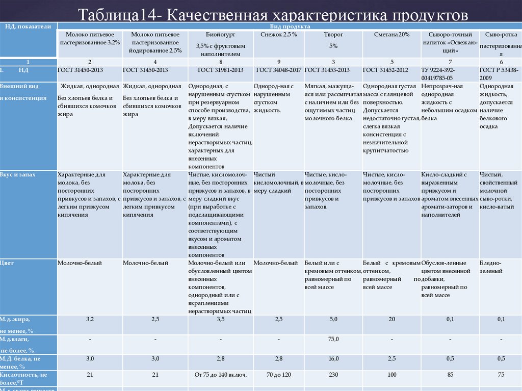 Таблица14- Качественная характеристика продуктов