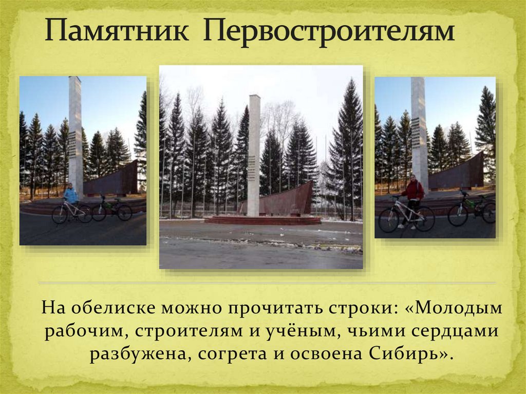 На обелиске можно прочитать строки: «Молодымрабочим, строителям и учёным, чьими сердцами